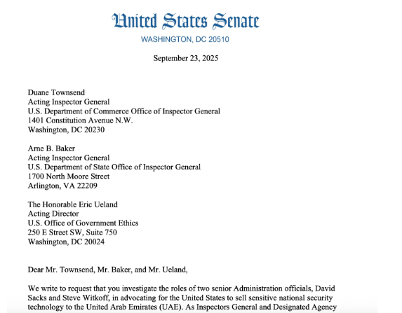 The senators cited a $2 billion investment deal between Abu Dhabi-based MGX and cryptocurrency exchange Binance, settled in USD1 stablecoin issued by Trump’s family-linked World Liberty Financial. Reports indicated that U.S. officials facilitated the agreement by offering access to advanced AI chips.