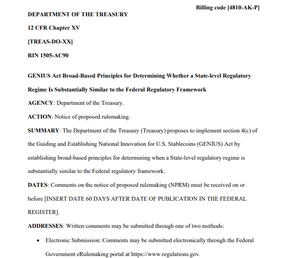 The US Department of the Treasury has issued a notice of proposed rulemaking seeking public input on state-level stablecoin governance frameworks under the Guiding and Establishing National Innovation for US Stablecoins Act. The proposal arrives as the market capitalization of dollar-pegged stablecoins approaches $300 billion, highlighting the growing importance of regulatory clarity in the sector.