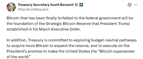 Bessent stated on X that the department remains committed to expanding Bitcoin holdings without increasing taxpayer costs, aligning with the administration’s vision to make the United States a “Bitcoin superpower.” He confirmed that Bitcoin seized in federal criminal cases would form the foundation of the reserve.