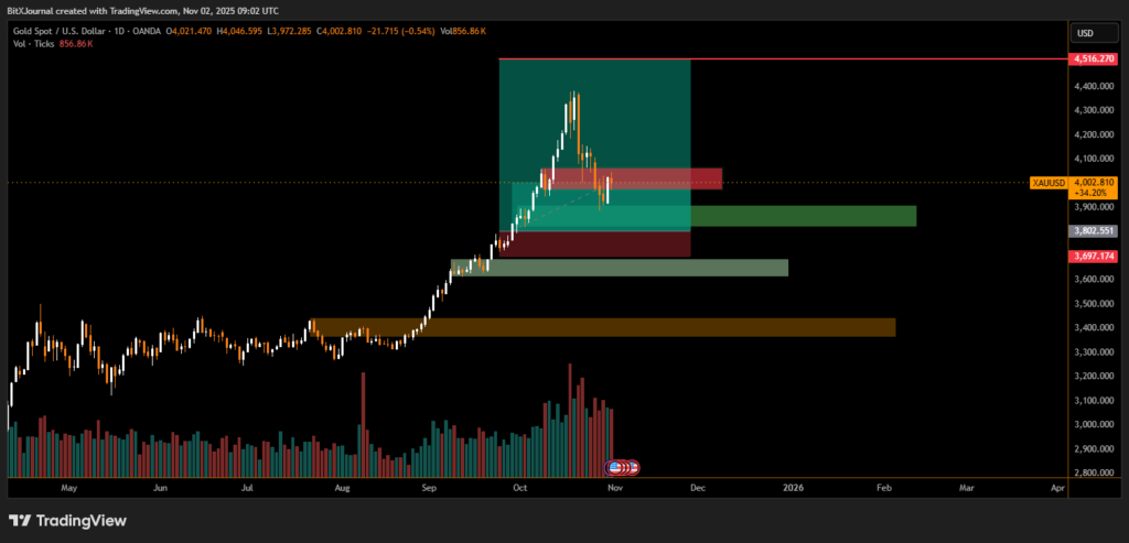 On October 30, the Fed cut its benchmark range to 3.75%–4.00%, a move widely expected. However, the tone accompanying the cut—where Chair Jerome Powell warned that further cuts are “not on a preset path”—triggered a stronger dollar and higher Treasury yields. Spot gold surged briefly but then consolidated below $4,000 per ounce, reflecting uncertainty rather than a clear safe-haven bid. As  BitXJournal analyst noted, “the Fed’s move was dovish in action but hawkish in tone.”