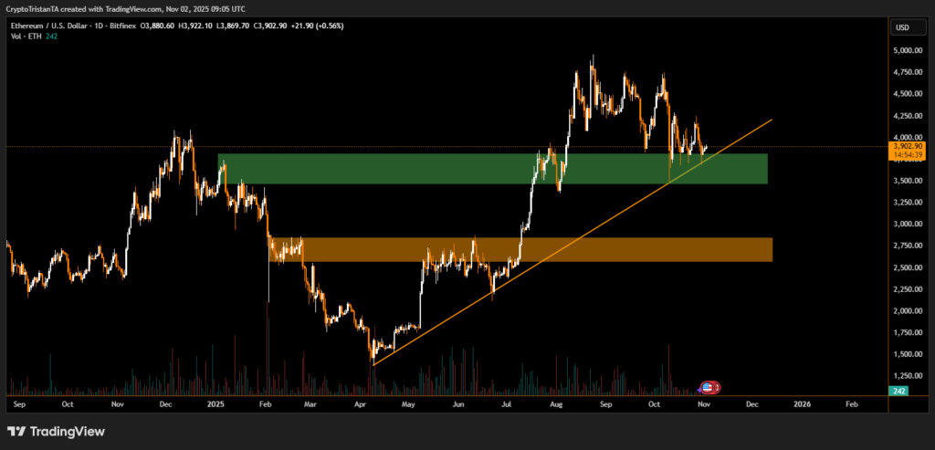 Ethereum (ETH): ETH traded near $3,900, down about 2.5% around Oct 30.  BitXJournal Analysts flagged the break below the $4,000 level as bearish: “Until the price is below that mark, bears keep controlling the situation on the market.”