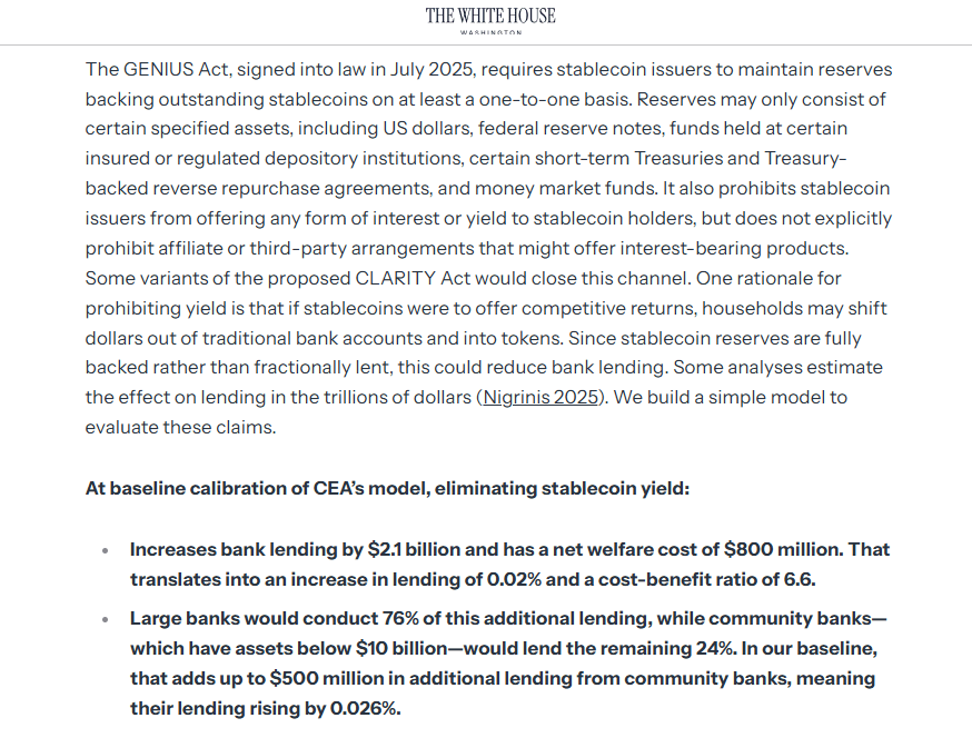 The report from the Council of Economic Advisers (CEA) found that prohibiting stablecoin yields would produce minimal benefits for banks. In the study’s base scenario, removing yield-bearing features increases lending by only $2.1 billion, roughly 0.02% of total U.S. loans, while imposing a net welfare cost on consumers.