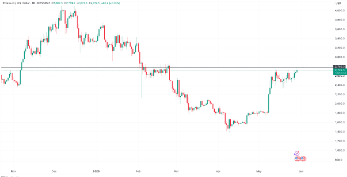 Ethereum (ETH) surged more than 4% over the past 24 hours to hit a three-month high of $2,789 on May 29, outperforming the broader crypto market. This bullish move follows a confirmed bull flag breakout on the daily chart, combined with record open interest in futures markets, rising funding rates, and strong inflows into spot Ethereum ETFs.