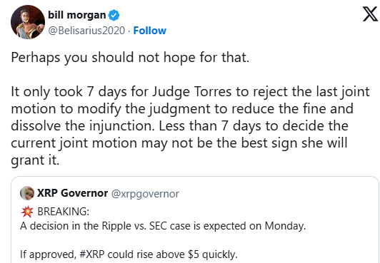 Prominent pro-XRP lawyer Bill Morgan reminded the community that Judge Torres previously rejected a similar motion within seven days — a timeline that could repeat. While he acknowledged the logic behind the settlement request, he also highlighted a flaw in Ripple’s approach.