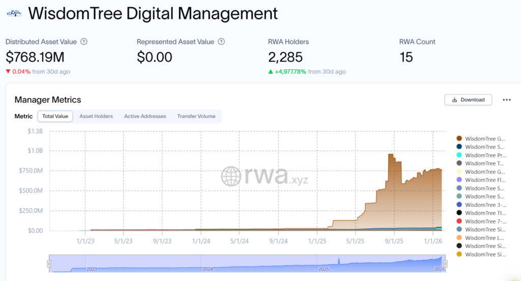 The firm has increasingly embraced blockchain-based fund issuance across networks including Ethereum, Arbitrum, Avalanche, Base, Optimism, Stellar, and Solana. Its tokenized offerings span U.S. debt money market funds, equities, fixed income, and alternative investments, totaling approximately $780 million in onchain assets. Additionally, WisdomTree’s advisory, licensing, and operational costs for crypto and metals rose to $73.5 million in 2025, reflecting growing institutional adoption.