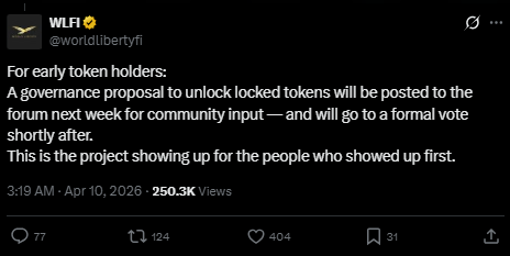 World Liberty Financial announced plans to introduce a governance proposal next week that will outline a phased unlock schedule for WLFI tokens held by early retail buyers. The proposal will first open for community input before proceeding to a formal vote, reflecting an effort to address growing concerns among token holders.