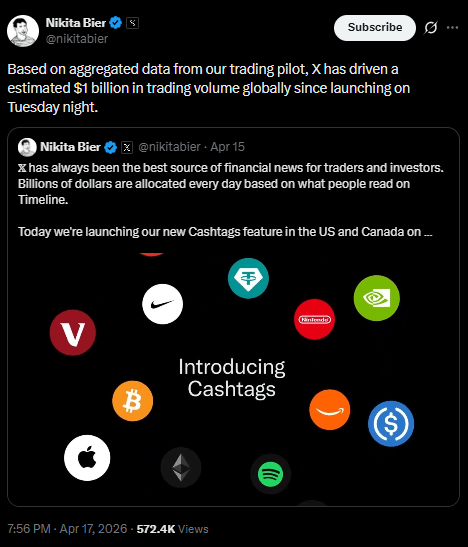 X has recorded approximately $1 billion in trading volume within the first two days of launching its new Cashtags feature, highlighting growing interest in social-based trading tools. The milestone was confirmed by Nikita Bier, who cited data collected from the platform’s early trading pilot after the feature launched on Tuesday night.