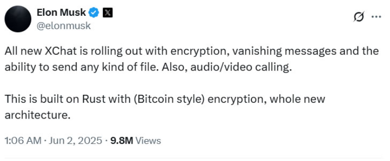 According to available details, XChat is built using the Rust programming language, known for its memory safety and concurrency features. Musk described it as having a “whole new architecture,” designed to support privacy-forward features such as disappearing messages and file transfer.