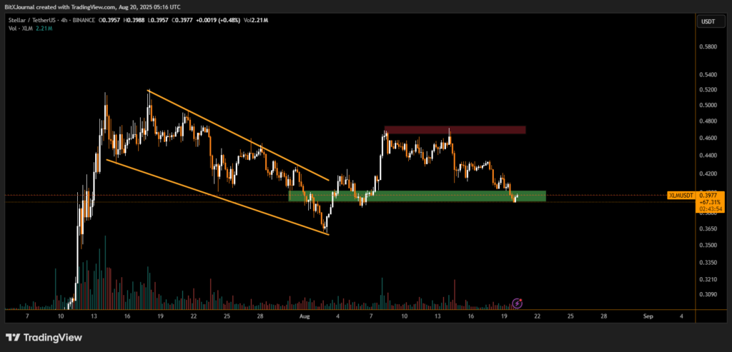 On the 4-hour chart, XLM has broken down from its recent consolidation, revisiting a key support zone near $0.39–$0.40. This level has historically acted as a cushion for price action, but the sustained sell pressure raises concerns about a possible deeper correction.