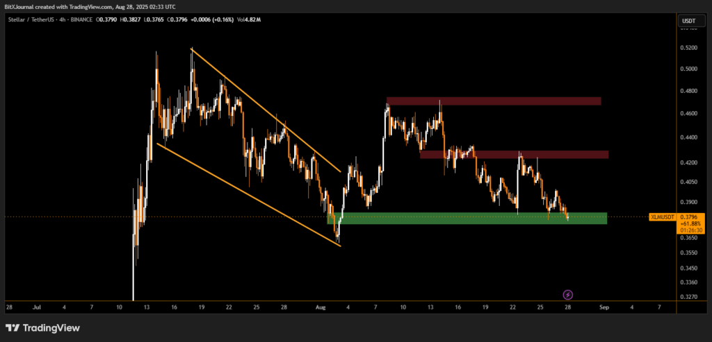 The 4-hour chart reveals that XLM has been in a downtrend since mid-August, facing heavy selling pressure after failing to break resistance near $0.48 and $0.43. Currently, the asset is consolidating in the green demand zone ($0.37-$0.38), which has historically acted as a strong support level.