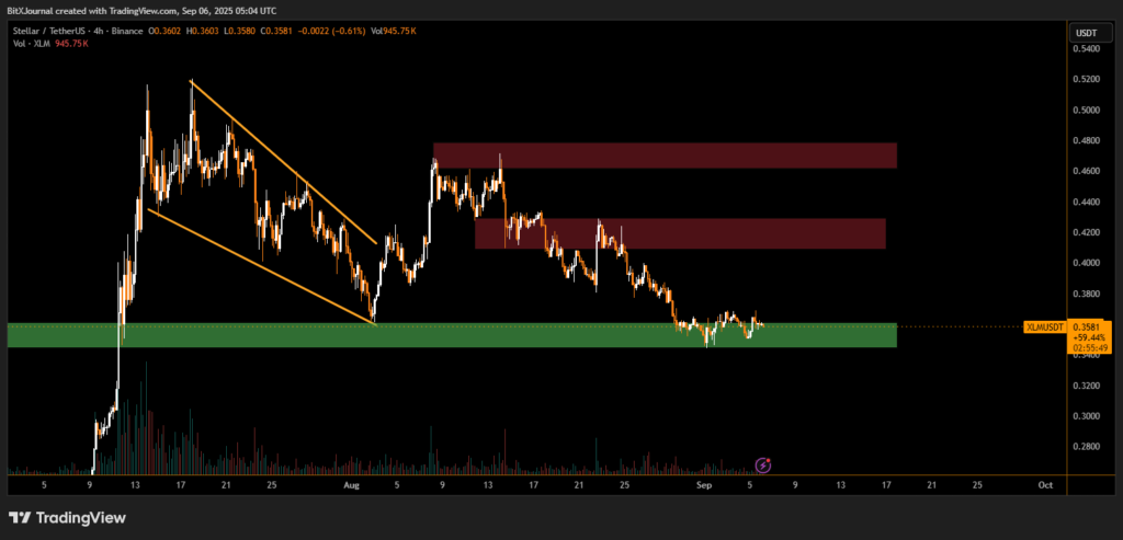 XLM previously broke out of a falling wedge pattern in early August, which initially favored bullish momentum. However, the inability to sustain moves above $0.42 has left the token range-bound. Traders are now closely watching whether Stellar can defend the $0.34–$0.36 support band and attempt another move toward resistance.