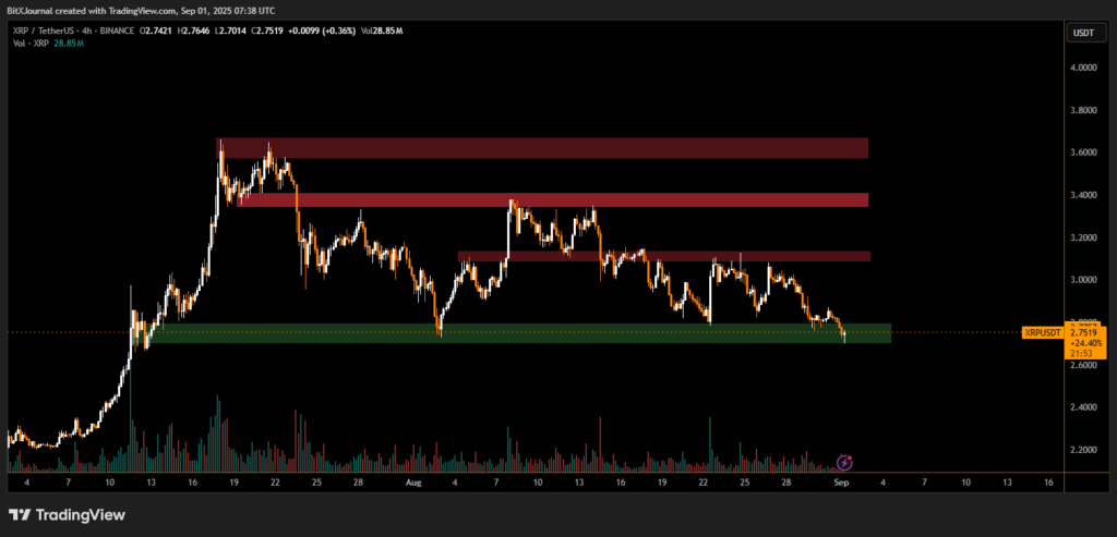 The price of XRP has slipped below the $2.80 support level, marking a bearish start to September as sellers dominate the market. This decline has pushed the cryptocurrency into a critical demand zone between $2.65 and $2.80, an area that could determine its short-term direction.