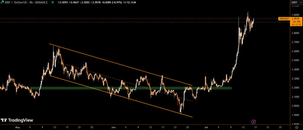 XRP is consolidating beneath the critical $3.00 resistance, forming higher lows and building a potential bullish setup ahead of the highly anticipated ProShares XRP Futures ETF, which is set to launch on July 18. The token closed at $2.89 on July 16, gaining 1.8% despite multiple failed breakouts above key resistance at $2.93.