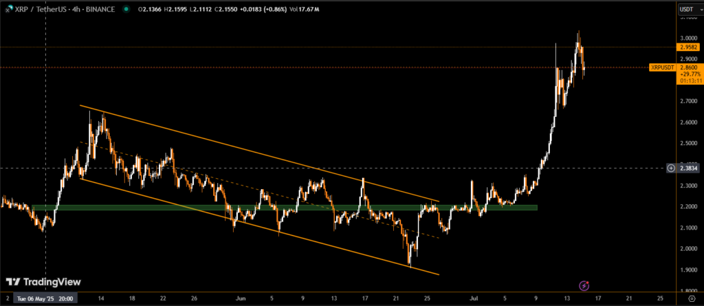 Between July 14 at 06:00 UTC and July 15 at 05:00 UTC, XRP traded within a 7% intraday range, topping out at $3.02 before sliding to a low of $2.78. The most notable movements included:
