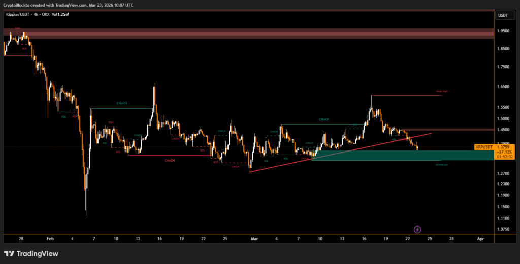 XRP is currently trading within a descending channel between approximately $1.38 and $1.42. Multiple attempts to reclaim the $1.40–$1.41 range have failed, turning that area into immediate resistance. The token has also faced repeated rejection below the broader resistance zone between $1.55 and $1.60 since mid-March, preventing sustained recovery.