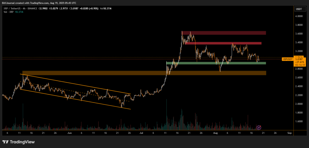Currently, XRP trades near $3.02, hovering above the $2.96 demand zone, which has acted as a reliable support area in recent weeks. If bulls fail to defend this level, analysts warn of a possible retest toward the $2.80 liquidity pocket. On the upside, a clean break above $3.09–$3.12 could open the door for a push toward $3.35 and $3.60 resistance zones.