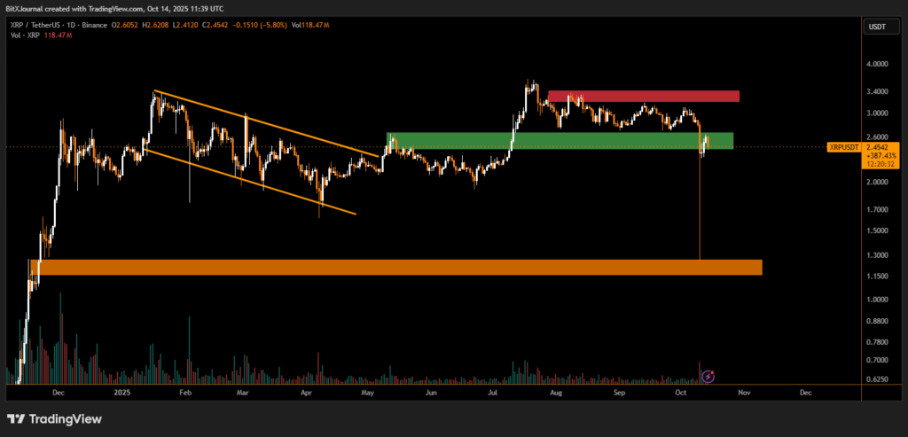 At the time of writing, XRP trades near $2.46, down more than 5% in the past 24 hours. Technical data shows that the altcoin rejected from a key resistance zone between $2.60 and $2.80, an area that previously acted as a strong support in September.