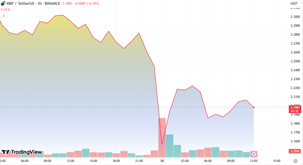 XRP experienced a sharp 6.16% drop, falling from $2.305 to $2.163, as global economic tensions triggered a high-volume market correction. This came in the wake of a U.S. court decision overturning Trump-era tariffs, which rippled across financial markets, denting investor confidence and reducing the total cryptocurrency market capitalization by 3.1%, now standing at $3.35 trillion.