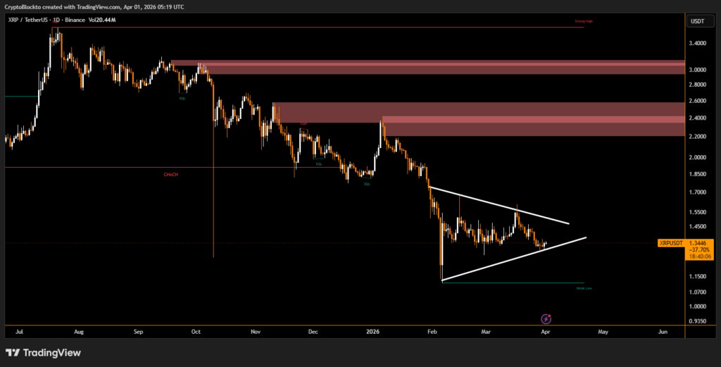 Analysts note that the mismatch between shrinking supply and limited price movement often resolves in a sharper directional move. Buyers have defended dips near $1.31-$1.32, establishing higher lows and maintaining structural support. Immediate resistance lies at $1.34-$1.35, with a successful break potentially opening the path toward $1.42 as the next upside target.