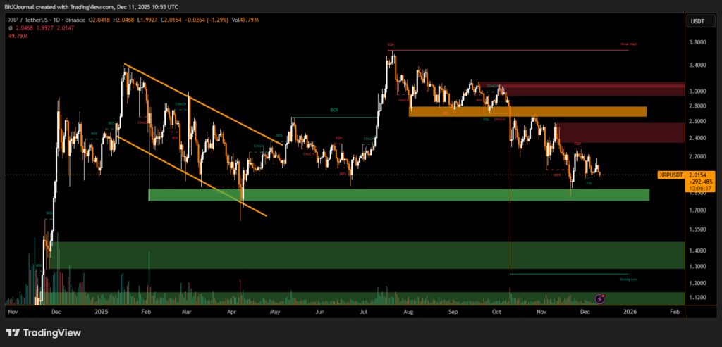 On the downside, XRP continues to trade above a key demand area around the mid-$1.80 region, where buyers have stepped in multiple times. However, the lack of momentum toward new highs indicates that the market is operating within a compressed range, waiting for stronger directional cues.