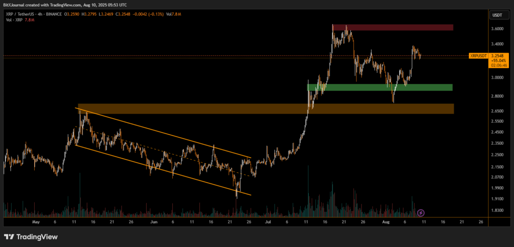 The chart highlights a descending channel pattern that dominated XRP’s trend from mid-May to late June, eventually giving way to a sharp bullish breakout. However, the rally has since met resistance, with the $3.65 area — marked by a historical supply zone — emerging as the key battleground for buyers and sellers.