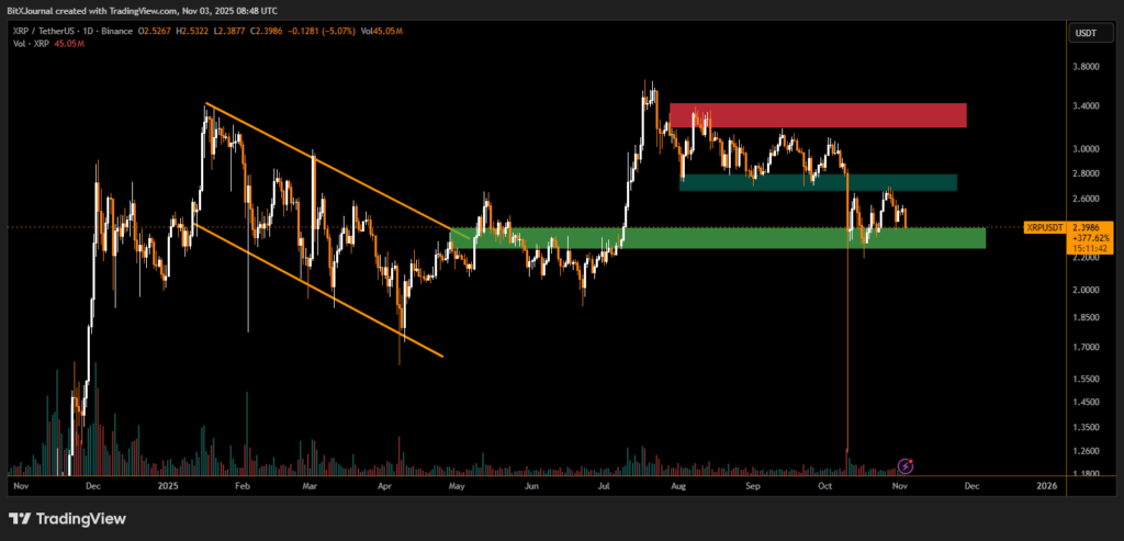 From a broader perspective, XRP remains above its long-term uptrend line, but momentum indicators are flattening, suggesting indecision among traders. Volume data also shows a gradual decline compared to early October, hinting that market participants are waiting for confirmation of a breakout.