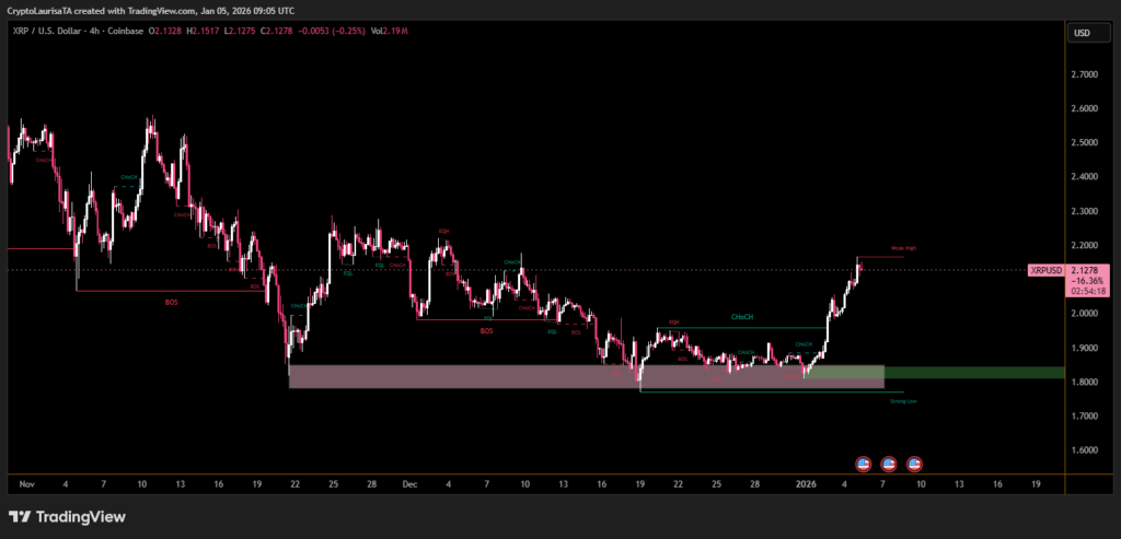 XRP has pushed decisively above the $2.12 resistance level, marking a technically significant breakout after weeks of consolidation. The move occurred alongside above-average trading volume, suggesting genuine market participation rather than a short-lived spike. This price action is unfolding against a backdrop of tightening supply and sustained institutional demand.