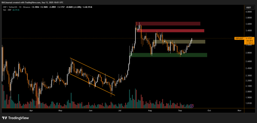 The chart indicates that XRP recently defended its green support zone around $2.80, an area where buying activity intensified. This bounce pushed the price into the $3.10–$3.20 range, a zone marked by a grey resistance band.
