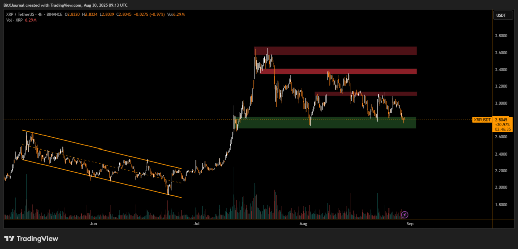 At press time, XRP trades near $2.80, after testing a crucial support zone between $2.70 and $2.85 (highlighted in green on the chart). This region has historically acted as a strong demand area following XRP’s breakout from its earlier descending channel in June, which preceded the sharp rally toward $3.80.