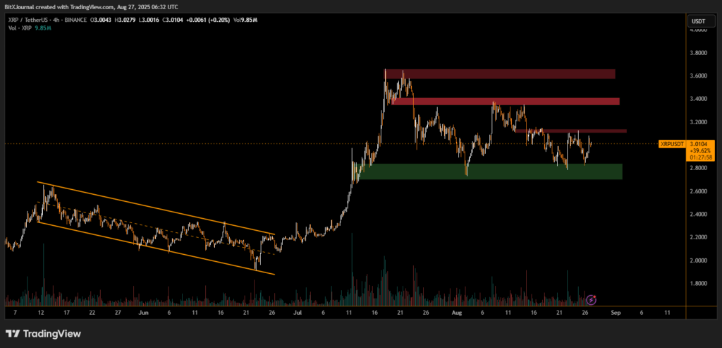 The XRP/USDT pair has gained traction after breaking out of a prolonged downtrend earlier this summer. The token recently tested $3.08 resistance but failed to sustain momentum, retreating slightly to consolidate around $3.01. Analysts note that XRP is forming a bull-flag structure, a technical setup that often precedes further upside if confirmed.