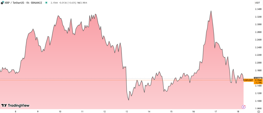 As of now, XRP trades narrowly around $2.164, with volume starting to taper off. This suggests the potential for short-term consolidation, but any further rejection from $2.20 could push the price toward the $2.10 level.