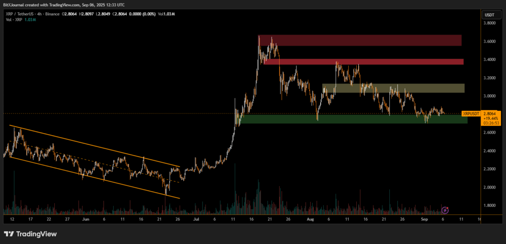 XRP is currently trading around $2.80, attempting to stabilize after a turbulent August that saw sharp swings between $3.70 highs and $2.65 lows. The asset remains up nearly 20% from July levels, but price action is now consolidating within a tight range, raising questions about its next move.
