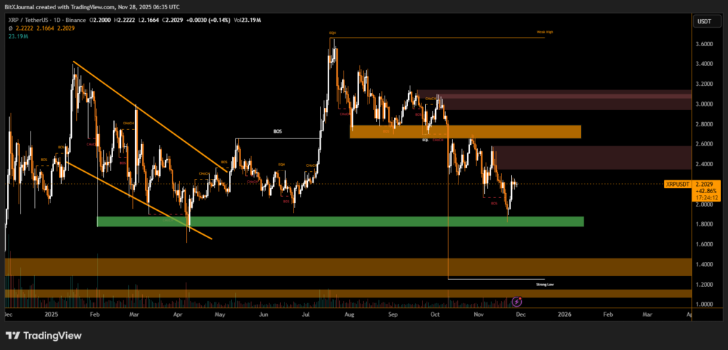 XRP’s path forward depends heavily on its ability to reclaim lost structure. While long-term sentiment remains constructive among some investors, technicals currently favor caution, with the possibility of a deeper correction still on the table. A decisive move above $2.24 would be the first sign that XRP is regaining strength; otherwise, the market may revisit lower levels in search of liquidity.