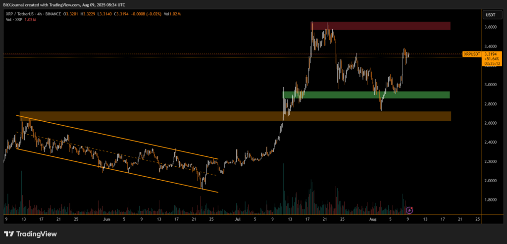 The 4-hour chart shows that XRP rallied strongly from the $2.85–$2.95 support zone, breaking through intermediate resistance before stalling below the $3.55–$3.60 supply area. This region has acted as a historical ceiling and remains the main hurdle for a sustained bullish breakout.