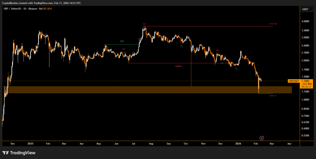 XRP is facing renewed downside pressure after sliding nearly 63% from its multi-year high of $3.66 to trade around $1.40. Recent chart patterns suggest the correction may not be over, with some analysts warning that a move below $1 remains a realistic possibility in the weeks ahead.