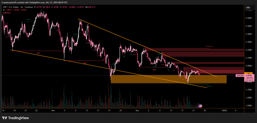 Trading volume remained elevated, pointing to active participation rather than low-liquidity drift. Increased volume during a modest price decline typically suggests distribution and short-term profit-taking, rather than strong accumulation. XRP briefly dipped below $1.90, triggering stop orders, before rebounding modestly back into its consolidation zone.