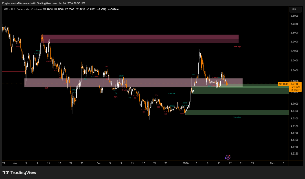 A late session flush briefly pushed price to $2.059, where buyers stepped in, stabilizing XRP near $2.07 into the close. Despite the bounce, the structure remains bearish in the short term, with lower highs and lower lows still intact below resistance.