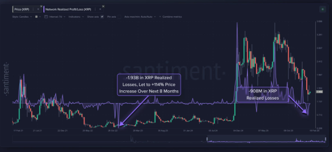 Blockchain analytics platform Santiment shows approximately $1.93 billion in realized losses over a single week. Realized losses reflect coins sold below their acquisition price, marking actual exits rather than temporary paper drawdowns. The last comparable surge occurred nearly 39 months ago, after which XRP rallied more than 100% in the following months.