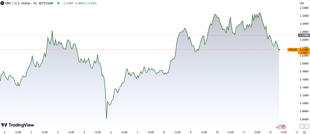 XRP fell 3.7% in the last 24 hours, retreating from a high of $2.288 to $2.260 after being rejected three times at the crucial $2.33 resistance level. This persistent barrier has shifted short-term sentiment, despite recent optimism from regulatory wins and ETF speculation.