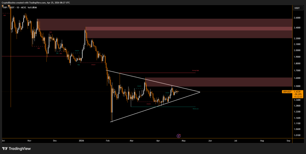 XRP is trading in a tight range near $1.44, showing signs of consolidation just below a major resistance level. Recent price action indicates that while upward attempts continue to face selling pressure, each pullback has been shallower than the last, suggesting that sellers may be gradually losing momentum.