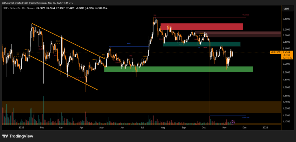 On the charts, XRP recently broke out of a descending channel that had defined price action since early 2025. The breakout confirmed a bullish structure shift (BOS), while the next area of resistance is projected between $2.80 and $3.00, followed by a major supply zone near $3.20. Key support remains around $2.10, where buyers previously defended the trend.