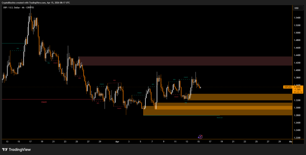 Price action showed XRP rising from $1.32 to $1.38, breaking above the $1.325–$1.33 resistance zone with strong trading volume. However, the rally struggled to sustain momentum and pulled back slightly to around $1.35, suggesting hesitation near resistance.