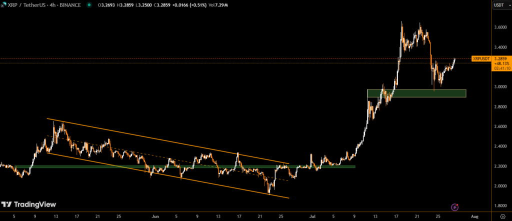 XRP showed strong technical resilience on July 27, posting a 1.3% gain over 24 hours and closing near $3.22 despite early-session volatility. The token rebounded from an intraday low of $3.16 and held support multiple times, forming a clear ascending channel pattern.