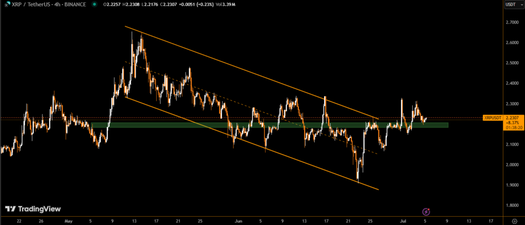 Volume spikes of over 56 million units during July 4th–5th reflect heightened trading activity. A failed rally attempt at $2.230 signals ongoing caution, but technical patterns remain supportive of future upside moves.