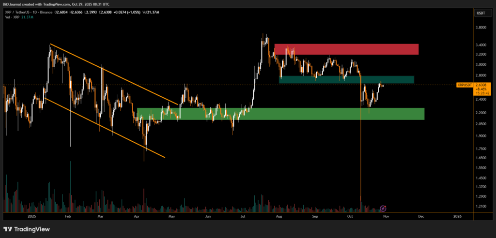 Ripple’s native token XRP extended its recovery this week, climbing above $2.63 amid rising trading volumes and renewed institutional inflows. The asset has rebounded nearly 8% from recent lows, yet technical indicators suggest the market remains at a critical inflection point.