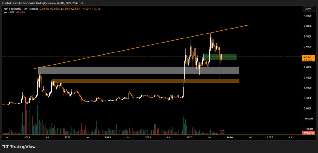 XRP is attempting to stabilize near $2.52 after facing a steep pullback from its 2025 highs above $3.70, according to the weekly chart. The digital asset, paired against Tether (USDT), remains in a long-term uptrend channel, though short-term sentiment has shifted toward cautious consolidation.