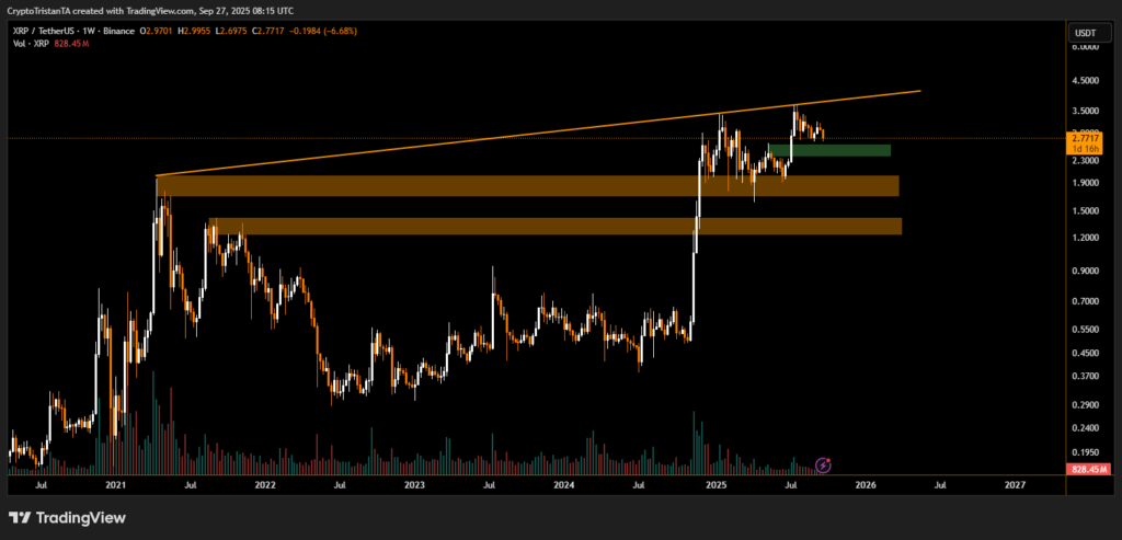 The cryptocurrency XRP (XRP/USDT) faced notable selling pressure this week, falling by 6.68% to $2.77 after failing to sustain momentum above a critical long-term resistance trendline visible on the weekly chart. This technical rejection has once again shifted investor focus to major support levels around $2.30, a zone that has historically provided stability.