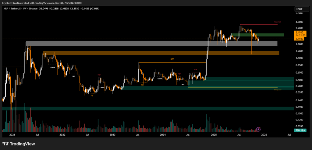 XRP’s weekly chart continues to offer a clear map of market structure, defined by a sequence of breaks of structure, equal highs, liquidity sweeps and major supply-and-demand zones. During the latest weekly session, XRP held above essential support despite encountering resistance at previously rejected zones. These technical boundaries remain central to understanding the asset’s next directional move.