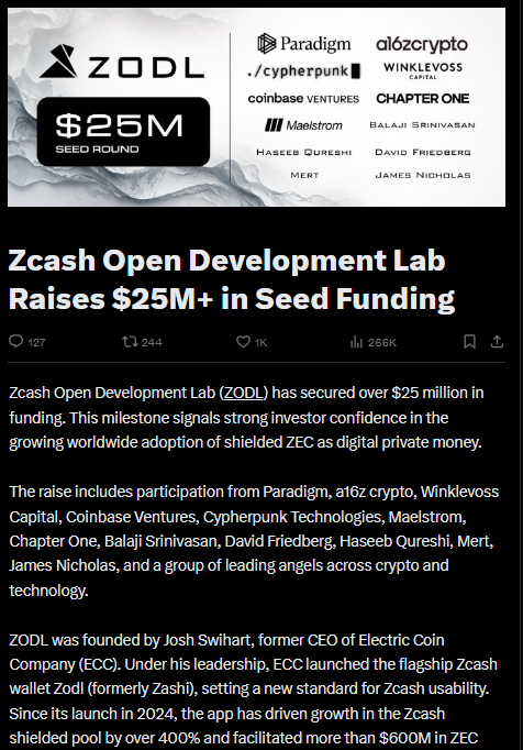 Zcash Open Development Lab (ZODL) has raised $25 million in seed funding as it moves to expand development within the Zcash ecosystem. The round attracted several well-known investors in the digital asset sector, including Paradigm, a16z crypto, Winklevoss Capital, Coinbase Ventures, Cypherpunk Technologies, Chapter One and Maelstrom.