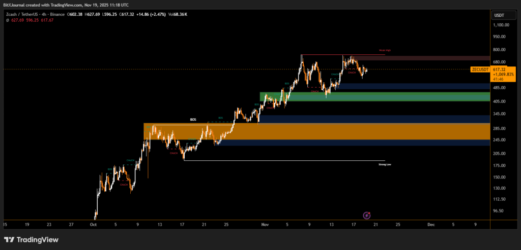 Zcash now trades between a heavy supply block overhead and solid demand layers below. A breakout above the weak high could open the door to another impulsive rally, while rejection may trigger a pullback toward 485 or even 405.